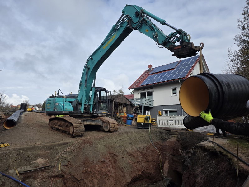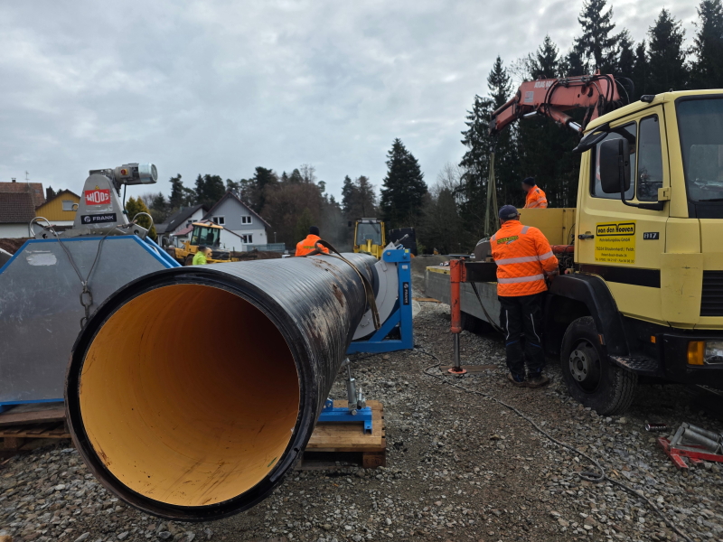 Derzeit sind mehrere Mitarbeiter aus unserem Tiefbau in Oberlengenhardt im Einsatz. Vor Ort findet eine große Kanalsanierung innerhalb eines Wasserschutzgebietes statt. Hierfür werden insgesamt 400 Meter PKS-Secutec Doppelwandrohre in den Durchmessern 600, 700 & 900 mm von der Firma FRANK verwendet, die speziell für die Leckageüberwachung entwickelt wurden. Die Rohre werden dabei vor Ort per Schweißverbindung miteinander verbunden. Ebenfalls verbaut werden passende PKS-Schächte in den Durchmessern 1200, 1500 & 1800 mm. Hierbei unterstützen uns Mitarbeiter der Firma Van den Hooven aus Straubenhardt. Die Bauarbeiten werden noch bis Ende Mai 2026 andauern.