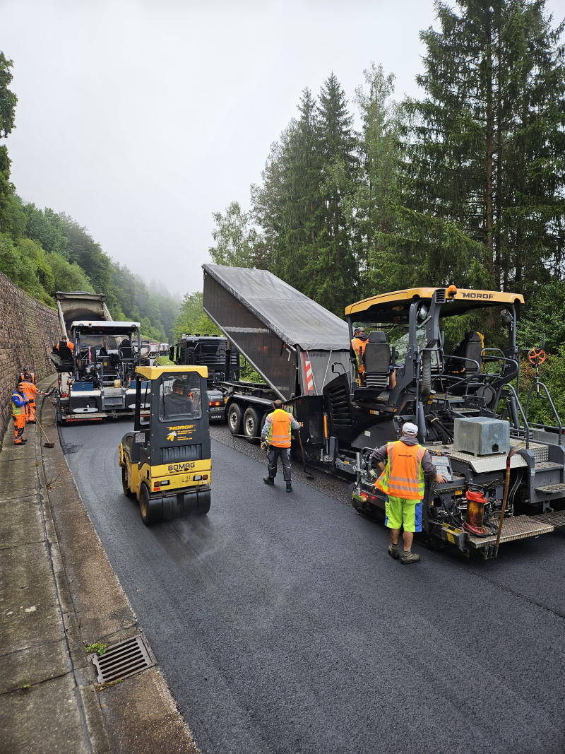 Unse­re Asphalt­ko­lon­ne war vor weni­gen Wochen in der Nähe der Sta­ti­on Tein­ach an der B463 im Ein­satz. Zusam­men mit der Fir­ma Euro­via wur­de eine Fahr­bahn­de­cken­sa­nie­rung über ins­ge­samt 15.000 m² vor­ge­nom­men. Neben den Asphalt­ar­bei­ten wur­den unter ande­rem auch 29 neue Buda­plan-Abde­ckun­gen von der Fa. HV Kom­mu­nal­tech­nik ver­baut. Ins­ge­samt drei Wochen haben die Arbei­ten in Anspruch genommen.💪🤝